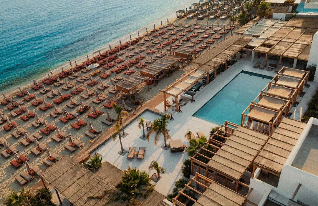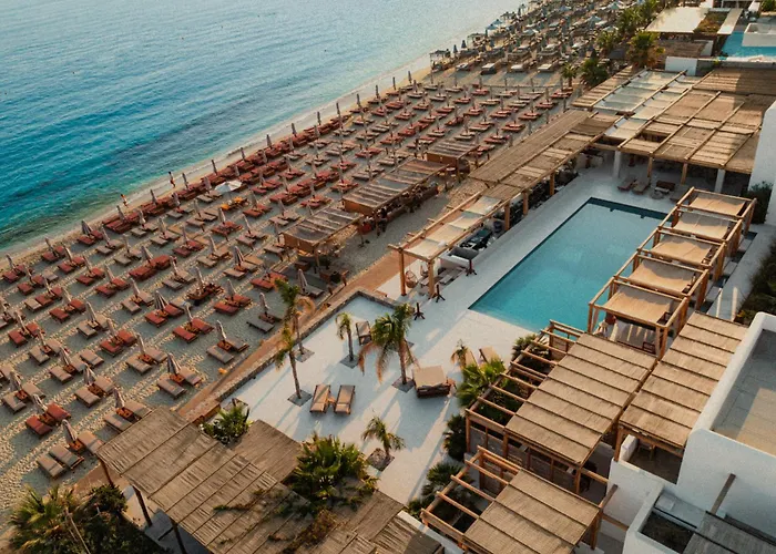 Branco Mykonos is a 5-star luxury hotel featuring an outdoor pool, beachfront dining, and an on-site spa. With an excellent Booking.com rating of 9.3/10, guests can enjoy amenities like 24-hour room service, a fitness center, and complimentary Wi-Fi.