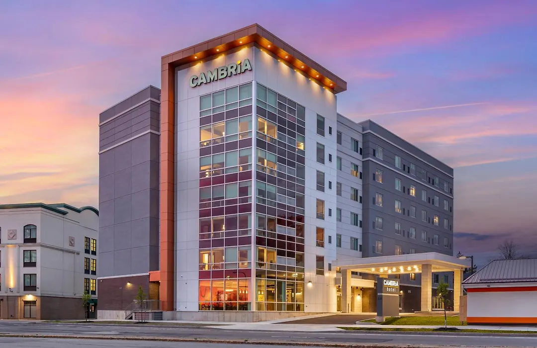 Cambria Hotel Niagara Falls offers modern accommodations rated 8.6/10 on Booking.com, featuring a casino and on-site dining options. The hotel provides facilities such as a fitness center and a shared lounge.