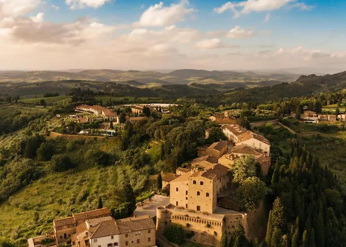 The 5-star Toscana Resort Castelfalfi, rated 9.7/10 on Booking.com, features a 27-hole golf course and a range of wellness options, appealing to sport and leisure enthusiasts alike. It is part of a larger resort that includes various villas and apartments in a scenic rural setting.