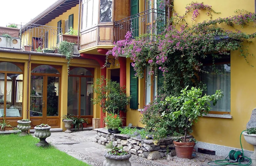 The hotel features a bar area for drinks after a day of exploration. Nearby dining options include restaurants serving Lombard cuisine and pizza, all within a short walking distance from the hotel. The terrace and garden setting provide additional spaces for relaxation.