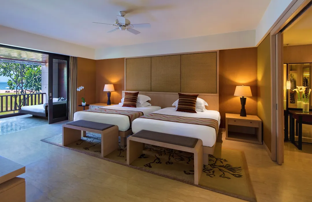 Conrad Bali features a variety of rooms, suites, and villas, with options including spacious suites equipped with a separate dining area, living room, and private terrace. The luxurious one-bedroom suites also offer marbled bathrooms complete with a soaking tub and rain shower. Each villa includes a private garden and pool, making them suitable for romantic getaways.