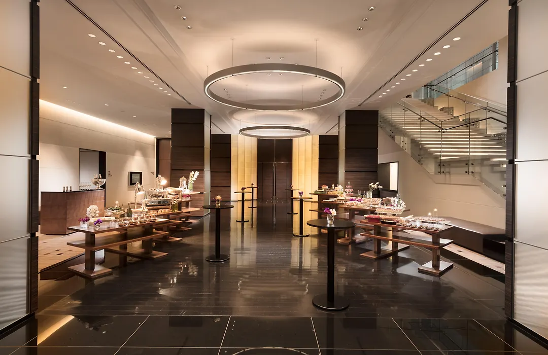 The hotel offers five dining options, including the Michelin-starred 'Gordon Ramsay at Conrad Tokyo' for fine contemporary French cuisine. Guests can also indulge in traditional Japanese dishes at Kazahana and modern Chinese cuisine at China Blue while enjoying skyline views.
