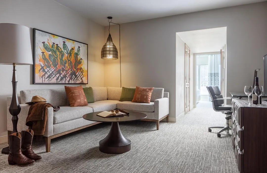 The spacious suites are artfully designed with floor-to-ceiling windows, showcasing stunning views of the San Antonio skyline or the Riverwalk. Each suite features plush pillow-top beds, sophisticated decor, and in-room coffee facilities, accommodating both relaxation and productivity needs.