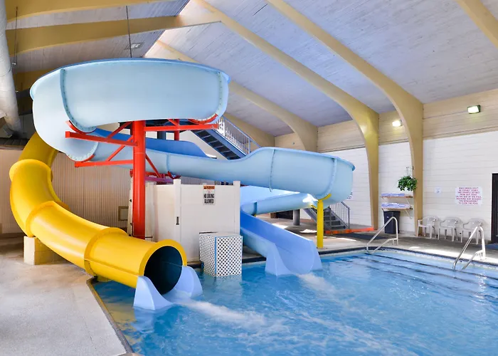 Recreational options include an indoor pool equipped with two waterslides and a hot tub, appealing to families. Guests can also access a fitness center on-site. The hotel features a large courtyard suited for outdoor events.