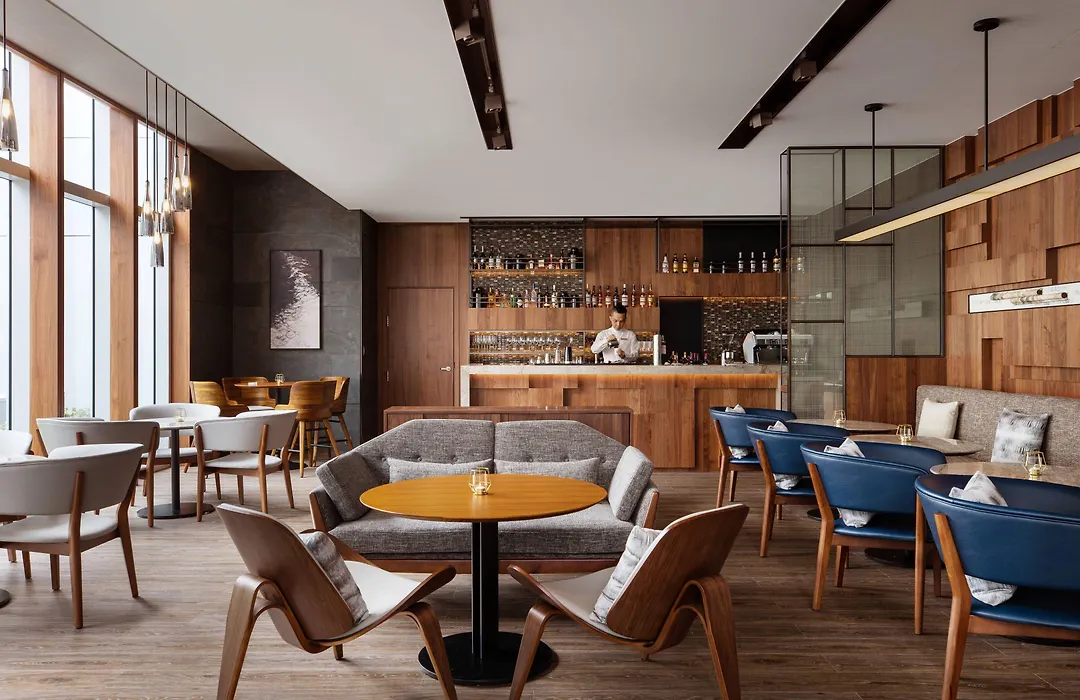 Dining at the MJ Kitchen offers a buffet-style selection for breakfast, lunch, and dinner with an open kitchen concept filled with natural light. The Drift Lounge Bar serves wine and cocktails, presenting great views of the Taipei skyline.