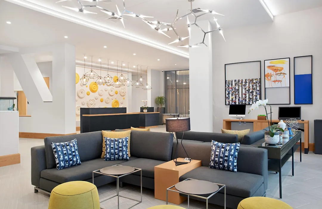 The hotel includes a 24-hour fitness center and a gaming center with PlayStation and Xbox consoles. Guests can also take advantage of conference spaces for business events, totaling 2512 square feet. The open-plan lobby is designed with natural light and seating arrangements for casual meetings.