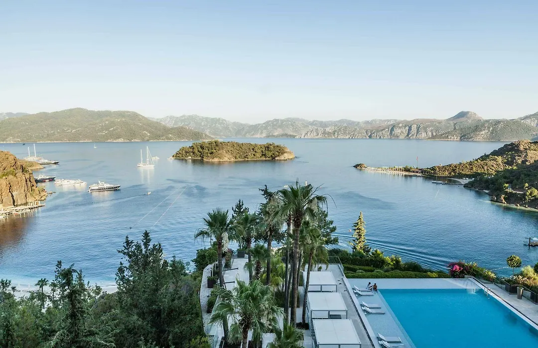 D Maris Bay, a 5-star Hisaronu hotel rated 9.3 on Booking.com, offers five white-sand beaches and extensive leisure facilities. The hotel features a variety of dining concepts, a luxury spa, and designer boutiques, all set amidst stunning bay views.
