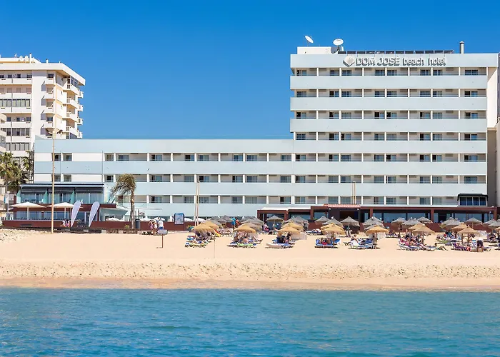 Dom José Beach Hotel, a 3-star Quarteira hotel with an 8.8/10 rating on Booking.com, features an outdoor pool, beach access, and panoramic views of the Atlantic Ocean. The hotel offers modern amenities including a gym, massage services, and free wireless internet throughout the property.