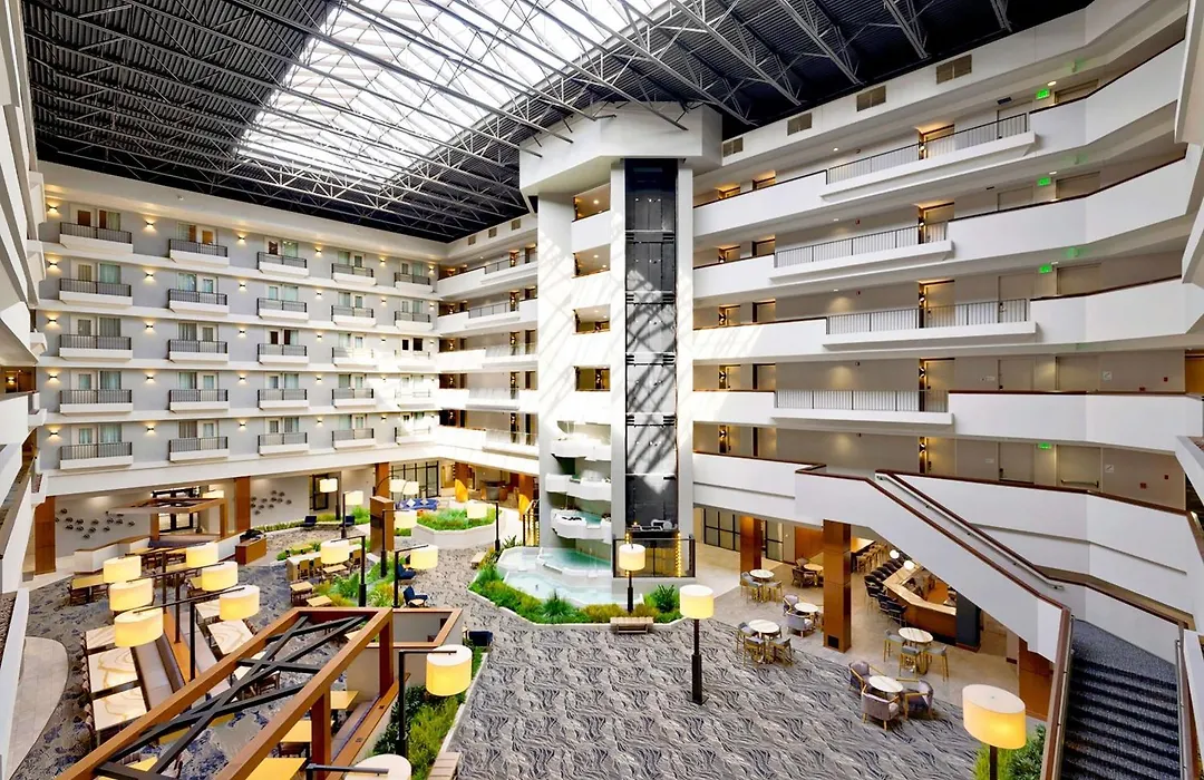 Café One Eleven serves American cuisine in a six-story tropical atrium setting, providing breakfast, lunch, and dinner options. The lounge offers a selection of cocktails and a comfortable space for relaxation.