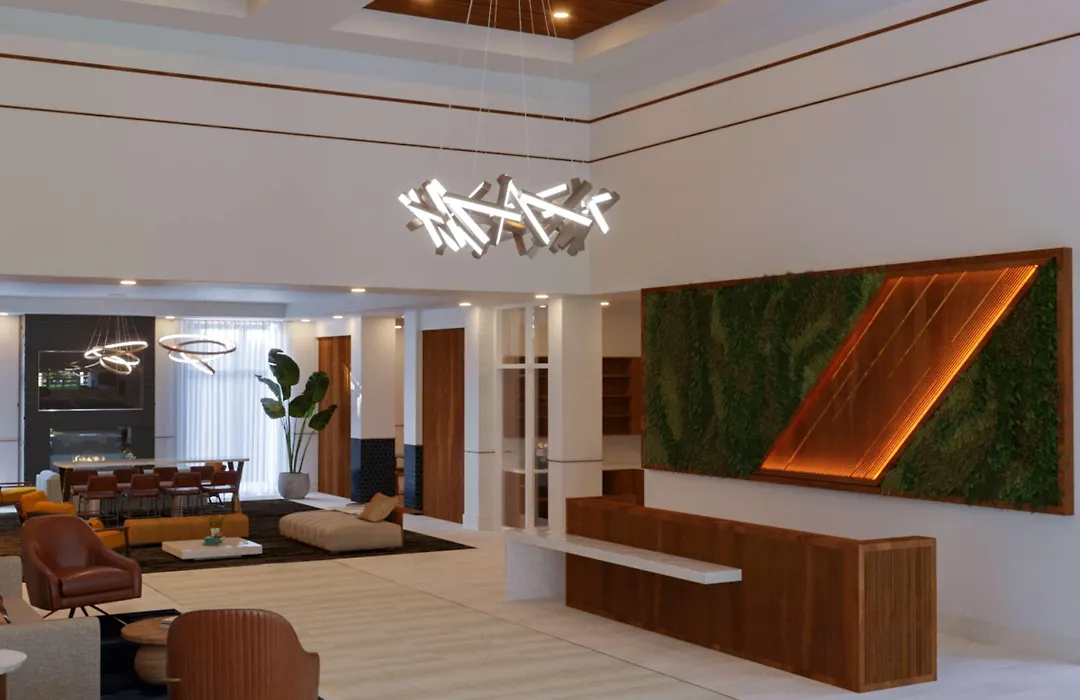 Leisure amenities include a swimming pool and an extensive fitness center featuring 24-hour access to Precor and Peloton(R) bikes. Outdoor spaces, including a fire pit, provide areas for relaxation.