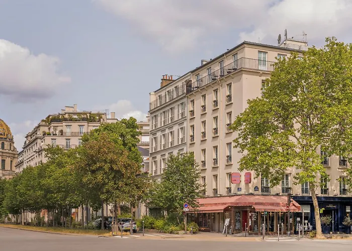 The hotel provides a cozy lobby area with leather seating and a fireplace, inviting guests to relax. Local attractions include the Eiffel Tower, Trocadero, and the Louvre Museum, all easily reached by public transport. The hotel is just a 2-minute walk from the Ecole Militaire Metro station.