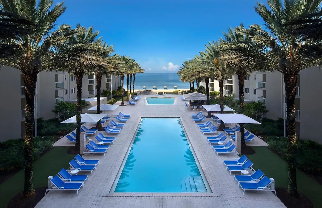 Dining options include Coast, a beachfront restaurant offering globally-inspired dishes like seared Florida grouper and Mediterranean Power Bowl. Reflections Pool Bar serves light fare and cocktails, ideal for post-swim relaxation. In-room dining is available for guests seeking privacy.