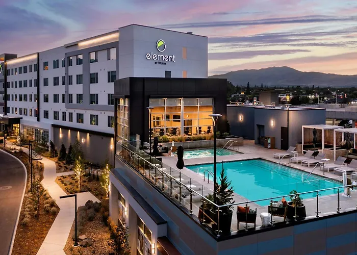 Element Reno Experience District, rated 8.8/10 on Booking.com, is a pet-friendly extended-stay hotel featuring a nature-influenced design. Guests can enjoy complimentary amenities like breakfast and WiFi.