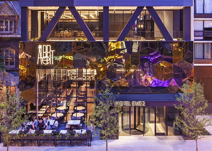 Accommodations at Hotel Emc2 include rooms with modern design, equipped with a 49-inch flat-screen TV, premium cable channels, and a coffee maker. Each room features plush bedding, a glass-enclosed wet lab shower, and luxury bath products, designed for optimal comfort and relaxation.