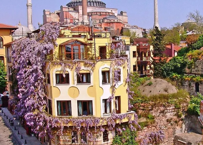 Hotel Empress Zoe, a 4-star Istanbul hotel rated 9.1/10 on Booking.com, features a charming atmosphere with a garden surrounded by palm trees and greenery. Guests can enjoy a free breakfast buffet and access to a rooftop terrace.