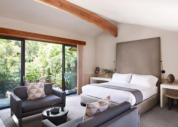 Gaige House, a 4-star boutique hotel, offers a unique blend of vintage wine country ambiance and modern Asian design. This Glen Ellen hotel features a serene setting along Calabazas Creek with an outdoor swimming pool and hot tub, plus numerous amenities for a comfortable stay.