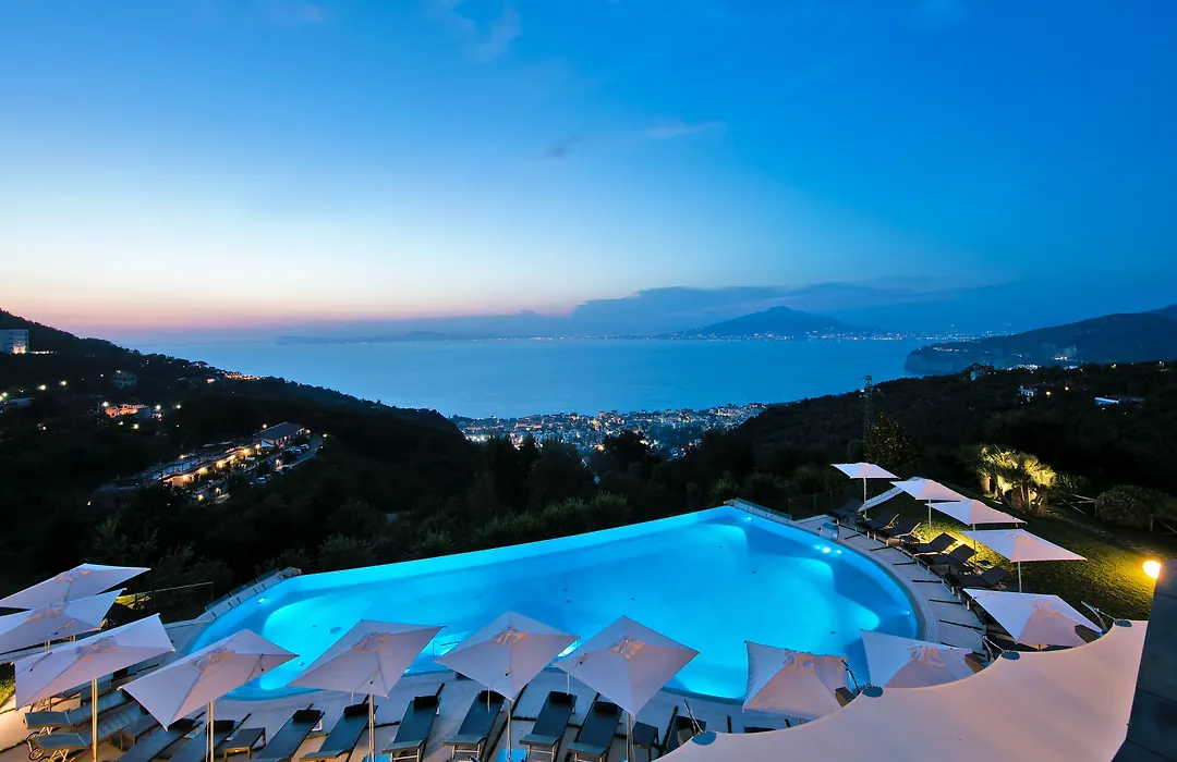 The Grand Hotel Due Golfi features 67 modern rooms, all equipped with air conditioning, flat-screen TVs, minibars, and en-suite bathrooms adorned with Vietresi tiles. Some rooms offer views of the gardens or the Bay of Naples, while others come with private terraces.
