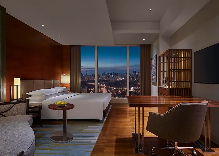 Grand Hyatt Manila features a panoramic view of the Makati skyline and Manila Bay. This 5-star Taguig hotel offers luxurious amenities including a large outdoor swimming pool, fitness center, and six dining options, designed for both leisure and business travelers.