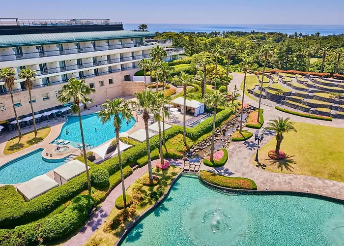 Grand Josun Jeju, a 5-star Seogwipo hotel with a 9.0/10 rating on Booking.com, features an outdoor swimming pool, indoor pool, sauna, and a fitness center. It offers accommodation with a restaurant, free private parking, and family-friendly facilities including a kids' club.