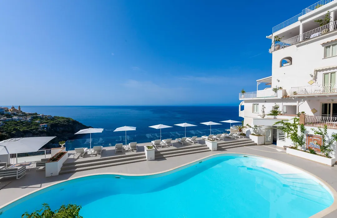 Grand Hotel Tritone boasts a commanding clifftop location with stunning sea panoramas and a private beach featuring a saltwater pool, bar, and restaurant. This 5-star Praiano hotel has a highly rated 9.7/10 score on Booking.com and offers personalized services in a refined setting.
