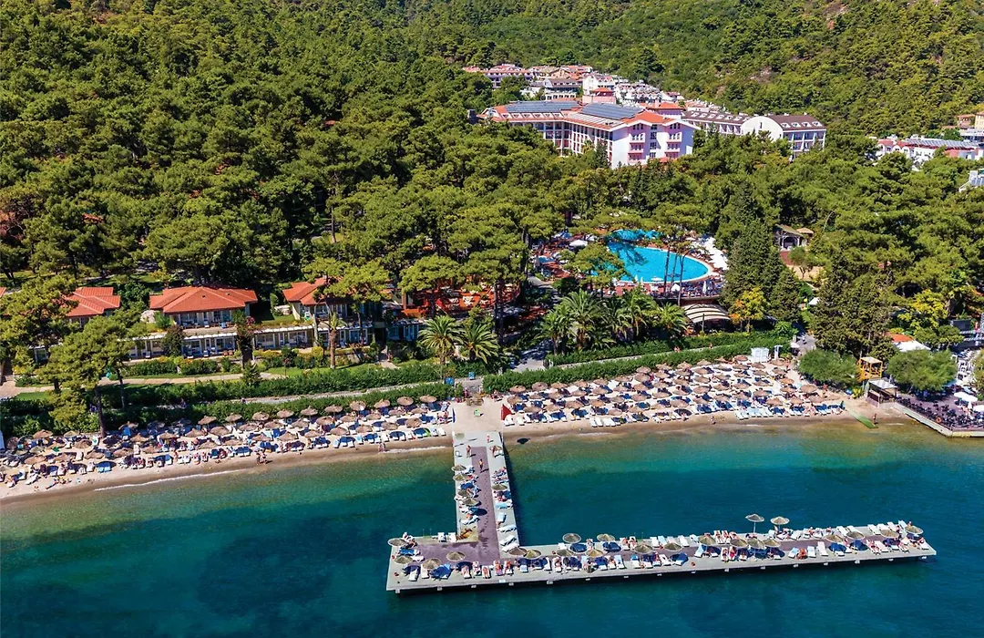 Grand Yazici Club Turban Termal is a 4-star Marmaris hotel featuring multiple pools, a private beach, and various dining options. Guests can enjoy amenities like a spa center, water park access, and a fitness center, all set against a backdrop of nature with views of the deep blue waters.