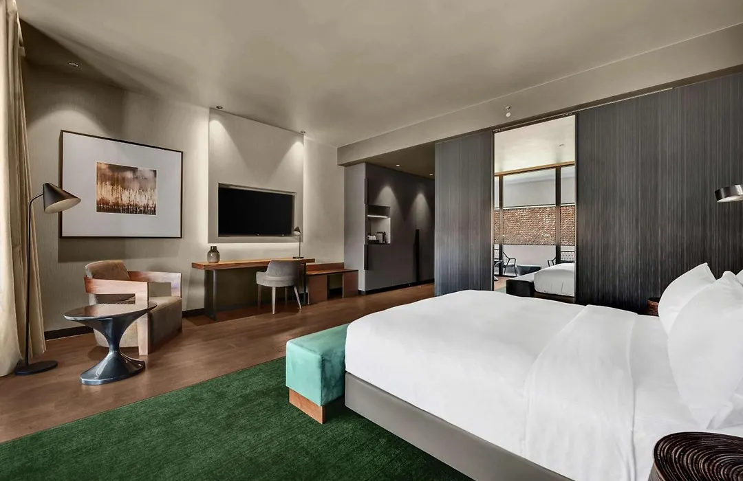The hotel's 194 air-conditioned rooms feature modern amenities, including a desk, minibar, coffee machine, and private bathroom with a bidet. Guests enjoy 24-hour room service and complimentary breakfast for children aged 5 and under.