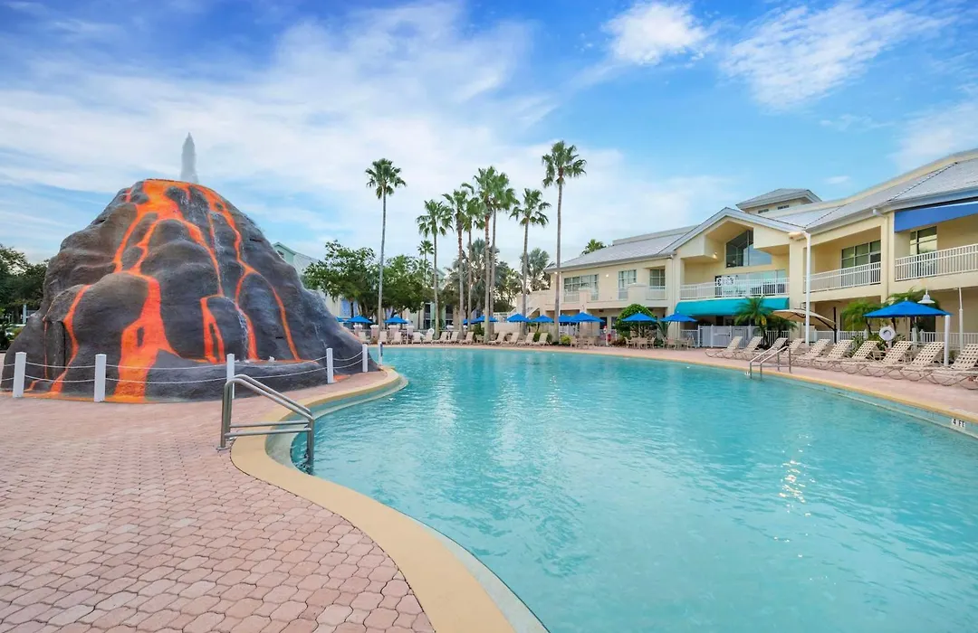 The resort features multiple pools, including a volcano pool with a waterslide, along with fitness facilities. Nearby attractions include NBA Experience, World of Disney, and Disney Springs, all within a few kilometers.