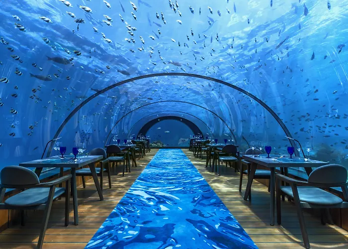 Hurawalhi Island Resort, a 5-star adult-only hotel with a 9.7/10 rating on Booking.com, features the world's largest all-glass undersea restaurant, 5.8. Guests enjoy access to exquisite dining, luxury villas, and wellness amenities. The property is renowned for its generous all-inclusive service and diverse aquatic activities.