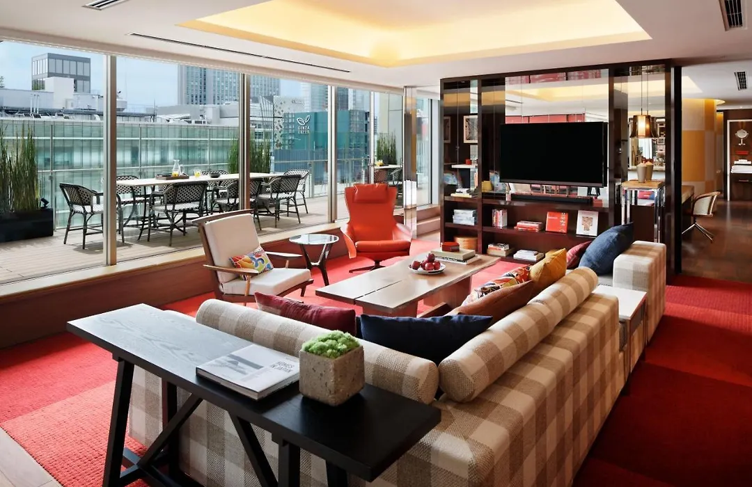 The hotel offers 164 guestrooms with premium bedding, air conditioning, complimentary WiFi, and amenities like minibars and LCD televisions. Richly patterned red window screens etched with images of Ginza enhance the decor throughout the property.