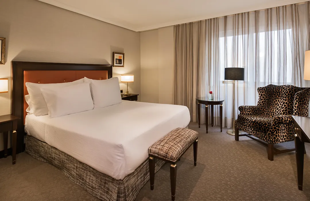 The elegant Hyatt Regency Hesperia Madrid is a five-star hotel located in the heart of Madrid, adjacent to major cultural institutions such as the Thyssen, Prado, and Reina Sofia Museums. Guests benefit from luxurious amenities including an on-site spa and multiple dining options, including restaurants with Michelin stars.