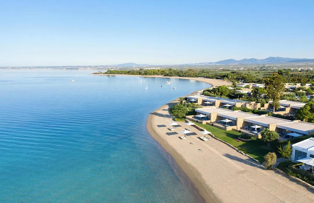 Ikos Olivia, a 5-star resort with a 9.1/10 rating on Booking.com, features a grand pool complex, multiple dining options, and extensive leisure facilities spread across 22 acres of lush greenery. Guests enjoy access to four restaurants offering dishes crafted by Michelin-starred chefs, a luxurious spa, and a variety of organized activities for all ages.