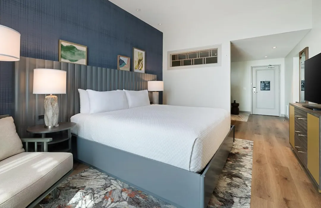 Rooms at Hotel Indigo Asheville Downtown feature flat-screen TVs, free Wi-Fi access, and spa-like bathrooms with ceramic tiled showers. The penthouse suites offer spacious living areas, soaker tubs, and breathtaking mountain views. Local art decorates the rooms, adding to the hotel's unique vibe.