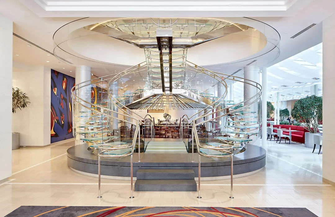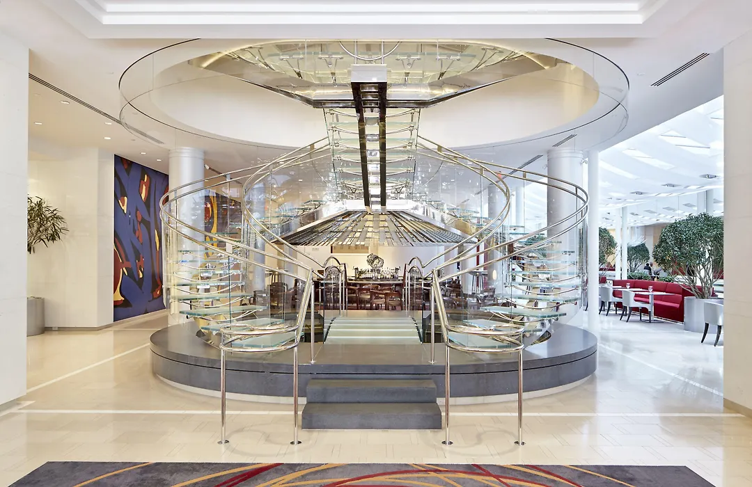 Dining options feature The Drafting Table Cocktails and Kitchen, serving classic American cuisine crafted from local ingredients. Guests can also enjoy cocktails at the circular bar or sample nearby eateries like Chick-fil-A and Benihana.