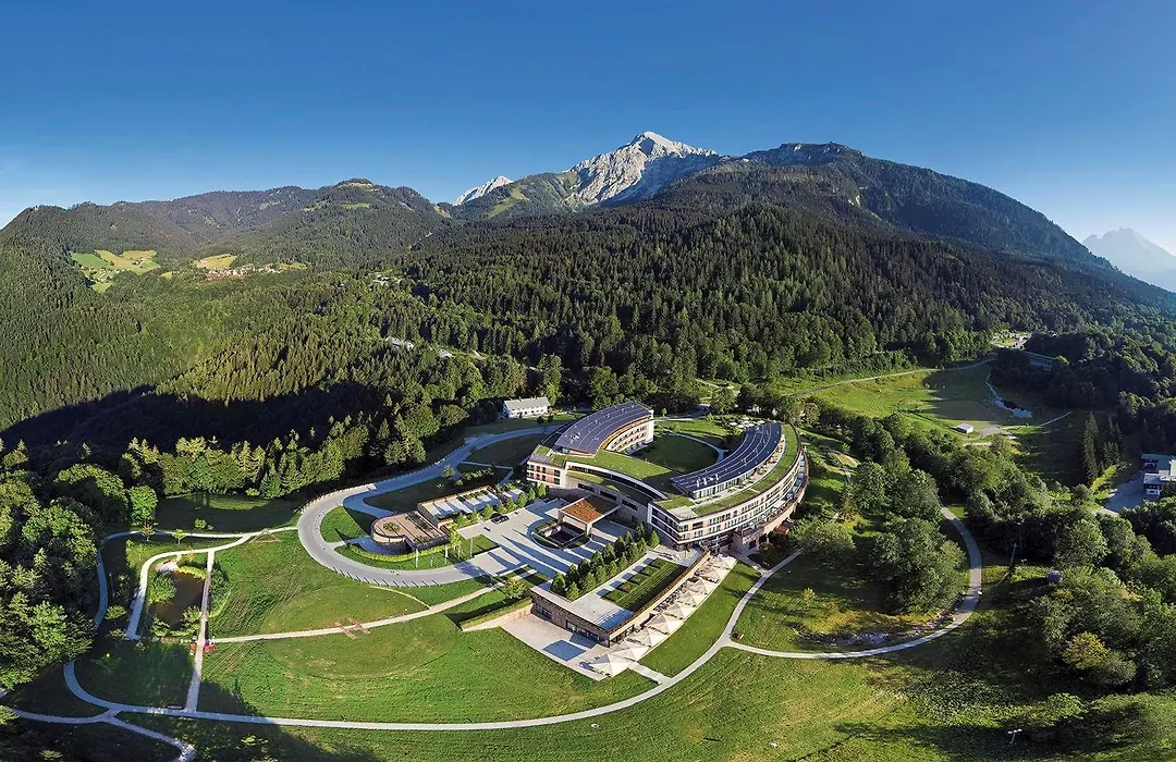 Kempinski Hotel Berchtesgaden is a five-star mountain resort offering luxurious amenities, including Kempinski The Spa with indoor and heated outdoor pools, and three gourmet restaurants, one of which holds two MICHELIN stars. The hotel features stunning views from an altitude of 3 ft, guaranteeing awe-inspiring vistas of the surrounding Bavarian Alps.