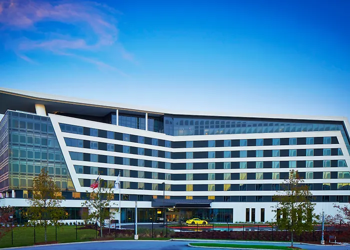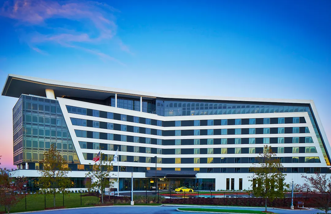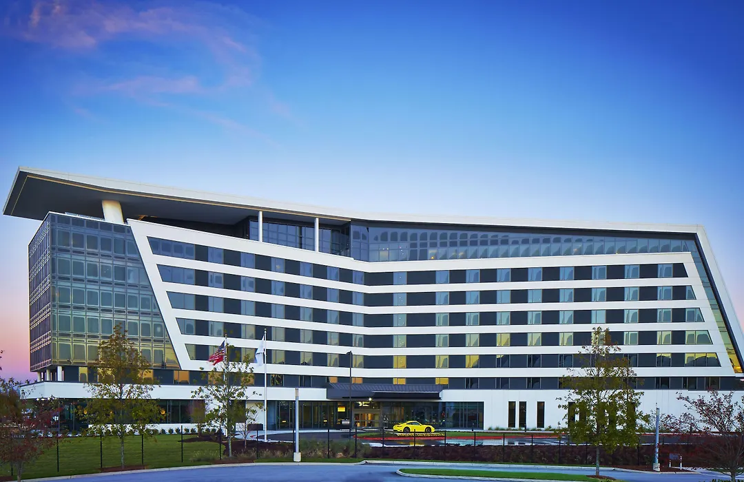 Dining options include APRON, offering modern Southern cuisine and signature cocktails, as well as The Rooftop, providing panoramic views of Hartsfield-Jackson Airport and the Porsche Experience Center. Guests can enjoy a complimentary evening wine hour.