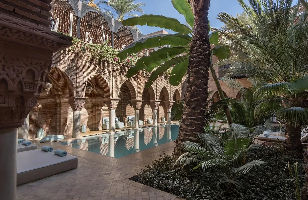 Leisure facilities consist of a heated swimming pool, a pink-hued spa with hammam and massage treatments, and a terrace with stunning views of the Medina. Guests can also explore nearby landmarks such as the Saadian Tombs and the Royal Palace, both within a 10-minute walk.