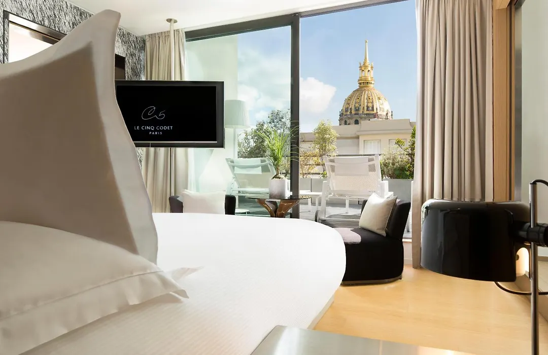 Le Cinq Codet offers 67 unique rooms and suites, each featuring large bay windows, modern amenities, and some with stunning views of the Eiffel Tower and Invalides Dome. The design reflects a blend of luxurious materials, evoking the elegance of ocean liners.