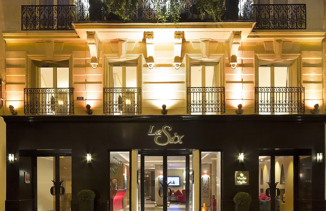 Le Six & Spa provides wellness facilities, including a hammam and massage rooms for guest relaxation. The hotel features public spaces like a library bar, winter garden, and small living room for enjoying drinks. For business needs, the Sixtine room accommodates up to 14 people for meetings.