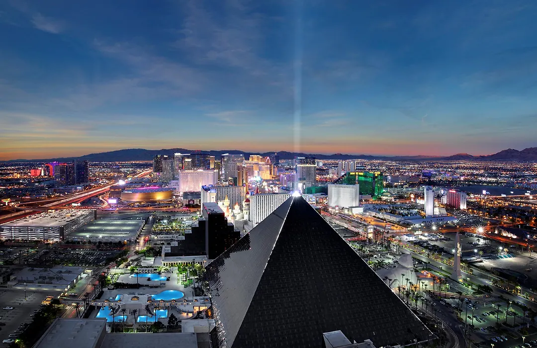 Luxor is a 3-star Las Vegas hotel featuring a striking black pyramid design. With a rating of 7.4/10 on Booking.com, it offers a large pool complex, diverse restaurants, and a casino experience.