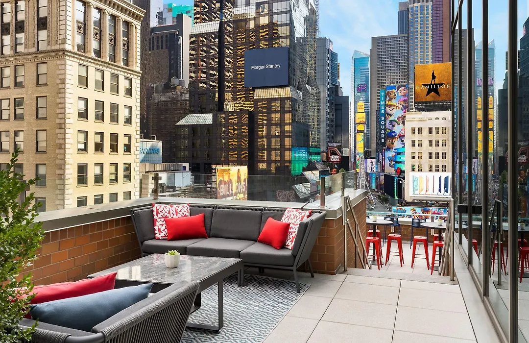 Dining options include Beast & Butterflies, offering a vibrant atmosphere with a diverse menu crafted from fresh ingredients. The rooftop terrace allows guests to enjoy cocktails while taking in iconic views of Times Square.