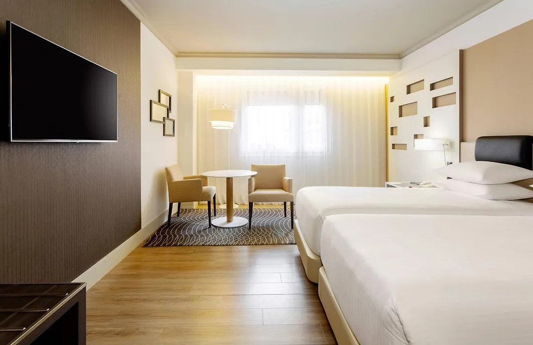 The hotel includes 869 rooms offering amenities such as air conditioning, minibars, and complimentary Wi-Fi. Rooms come with a private bathroom equipped with a walk-in shower and quality toiletries. Guests may also enjoy exclusive access to the Executive Lounge on the third floor.