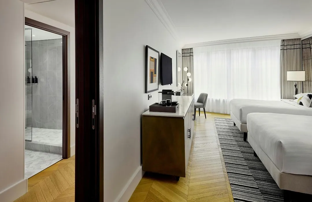 The Paris Marriott Champs Elysees Hotel offers 192 elegantly designed rooms and suites, including the prestigious Presidential Suite featuring two private balconies with a breathtaking 180-degree view of the Champs-Élysées Avenue, the Eiffel Tower, and the Arc de Triomphe. Guests enjoy premium bedding, thoughtful amenities like laptop-compatible safes, and luxurious bath products in a sophisticated setting.