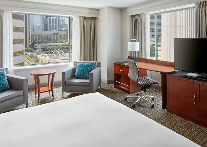 The hotel features 435 rooms, equipped with air conditioning, flat-screen TVs with streaming services, and complimentary high-speed Wi-Fi. Accommodations include plush bedding, seating areas, and deluxe amenities, making it suitable for business and leisure travelers alike.