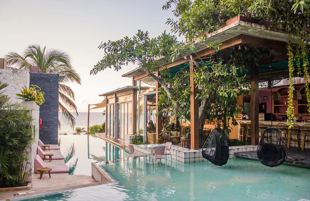 Mi Amor Tulum, A Small Luxury Hotel (Adults Only) is a 5-star Tulum hotel offering beachfront access and luxury accommodations. Features include a full-service spa, gourmet dining options, and stunning ocean views. The hotel has a Booking.com rating of 9.0/10.