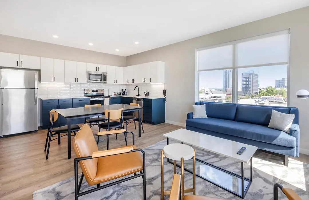 Leisure amenities include a third-story rooftop pool with city views and poolside cabanas. The fitness center offers a range of equipment for those looking to maintain an active lifestyle during their stay.