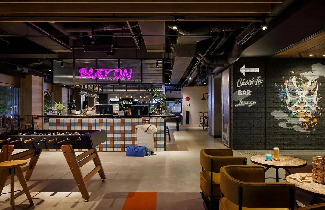 Dining options include a restaurant with 24-hour noodles and Japanese comfort food. Guests can also gather for cocktails and light fare at the Moxy Bar & Lounge.