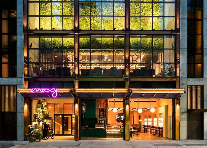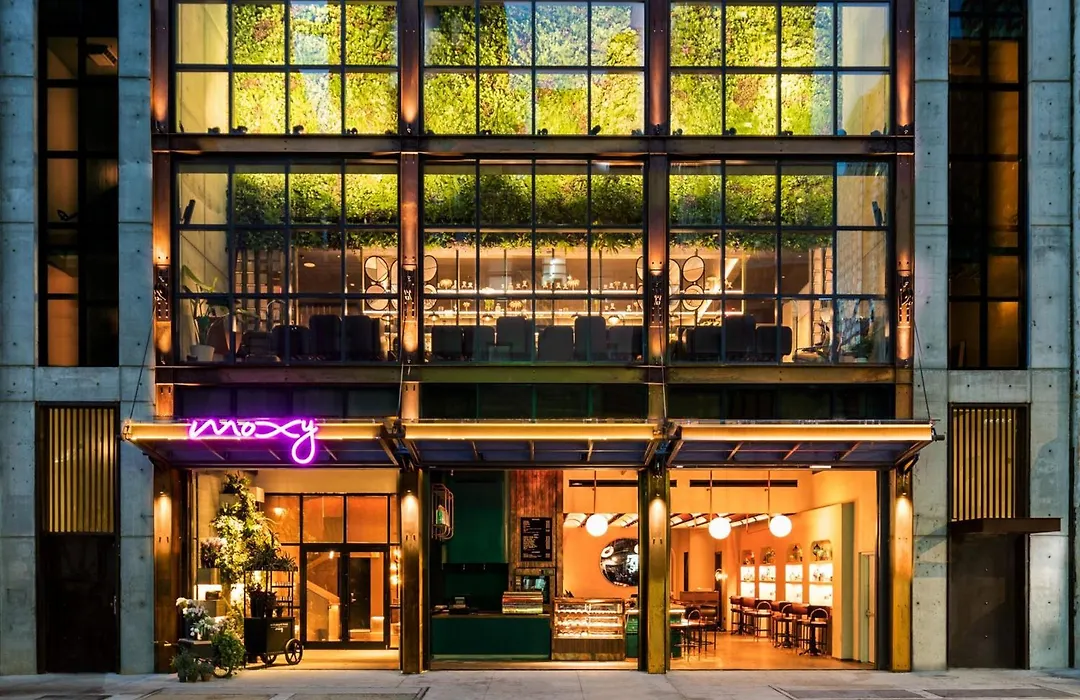 Moxy Nyc Chelsea, a 4-star hotel with an 8.3/10 rating, features an industrial facade and a greenhouse-style atrium. This pet-friendly hotel emphasizes compact design and vibrant public spaces, set in the Flower District. Notable amenities include a rooftop bar with panoramic views and a lively lobby bar offering modern bites.