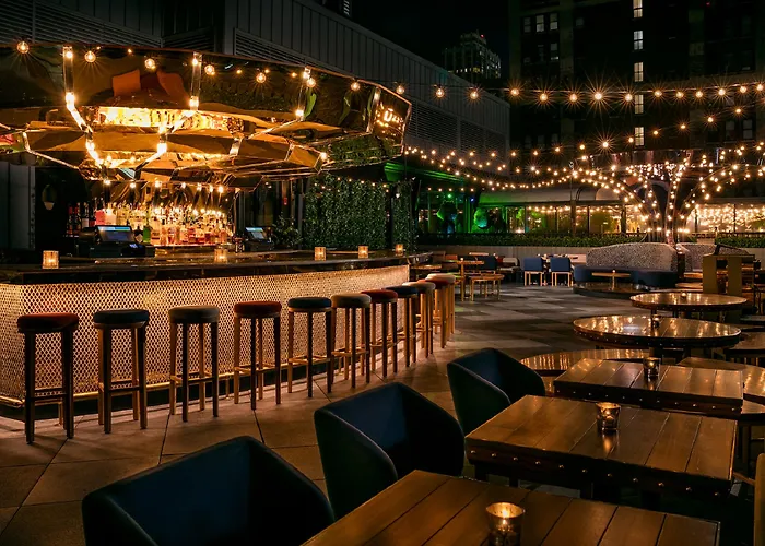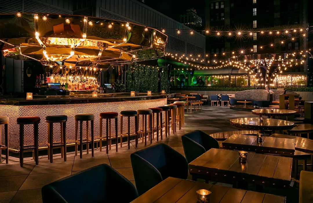 Leisure activities feature Magic Hour, the largest all-season indoor/outdoor hotel rooftop lounge in NYC, designed as an 'urban amusement park.' For those looking to socialize or work, Bar Moxy serves as both a lounge and workspace.