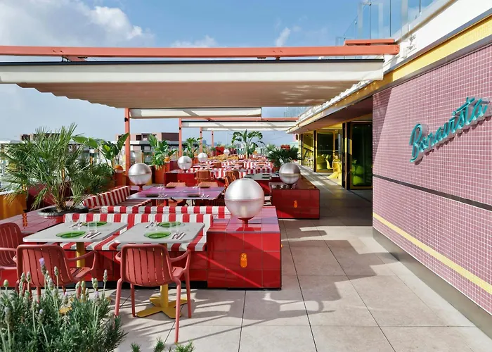 Leisure facilities at Moxy include a rooftop pool for refreshing swims during warmer months, serving as a scenic spot for social gatherings. Additionally, public transport access to cultural attractions like La Sagrada Familia and Camp Nou is just minutes away.