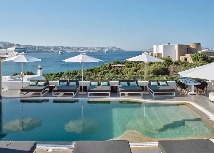 The hotel is a five-minute walk from Agios Stefanos Beach, offering easy access to water sports and beach activities. Nearby landmarks include Manto Mavrogenous Square and Little Venice, while transportation options include local bus services to Mykonos Island National Airport.